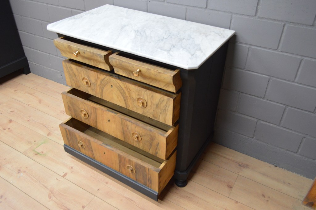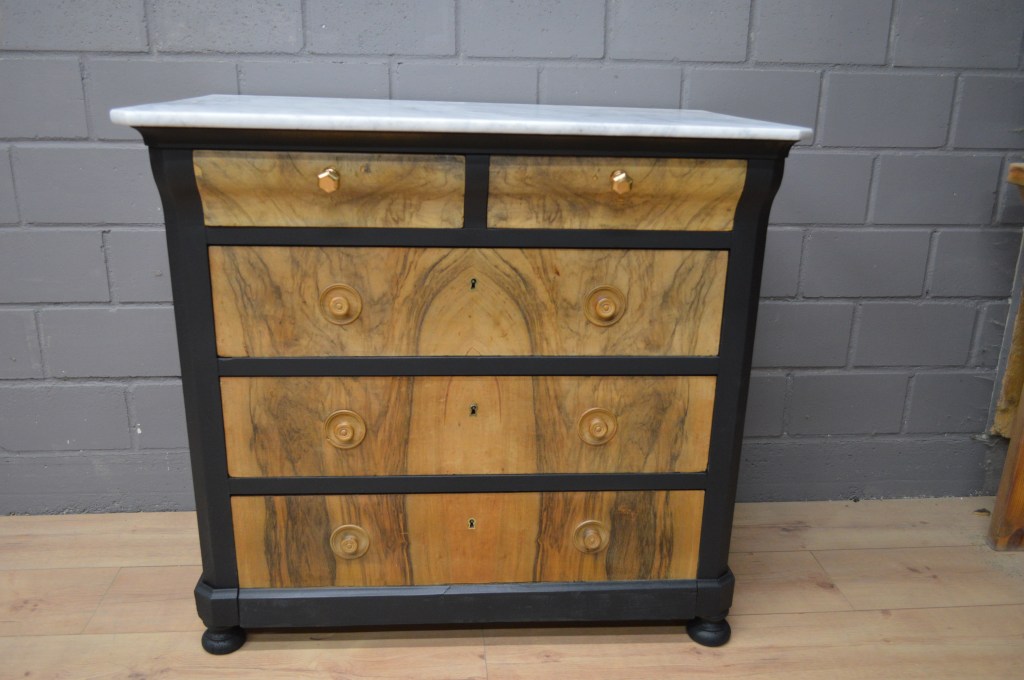 Commode bicolore noire et bois naturel avec 4 tiroirs et plateau marbre blanc
